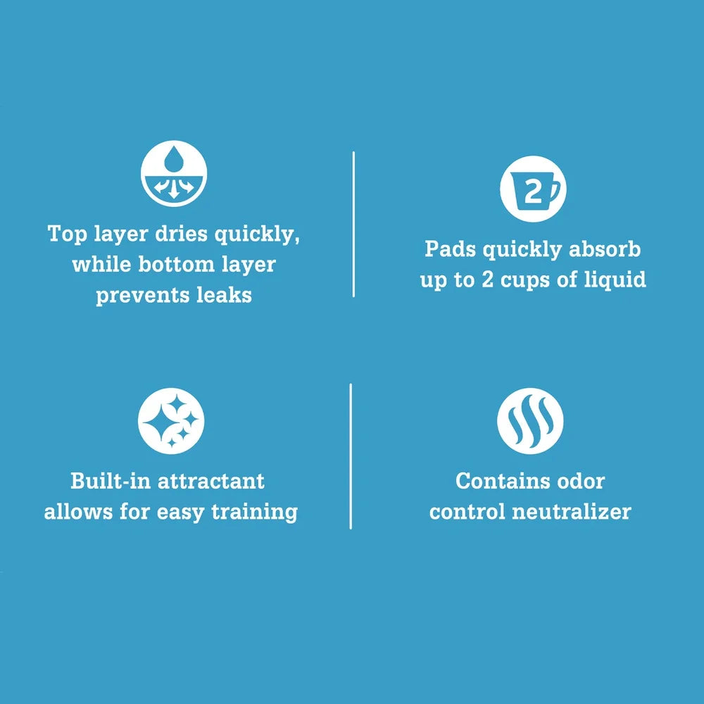 Each pad quickly absorbs up to 2 cups of liquid; the top layer dries quickly while the bottom layer prevents leaks. Activated carbon helps neutralize odors. To use, unfold the puppy training pad and place it plastic-side down in an area your puppy stays, but away from her bed and food. Place your dog on the pad so she can smell the pad and get used to it. You should do this several times. If your dog relieves herself elsewhere, bring her back to the pad immediately. This will reinforce the pad is the place to soil. When the dog relieves herself on the pad, praise her and reward her with a treat. Rewarding her will let her know she is doing what you want her to. Dispose of soiled pad and replace when needed. Once your dog is relieving herself on the pad on a regular basis, begin moving the pad closer to the door and eventually outdoors.